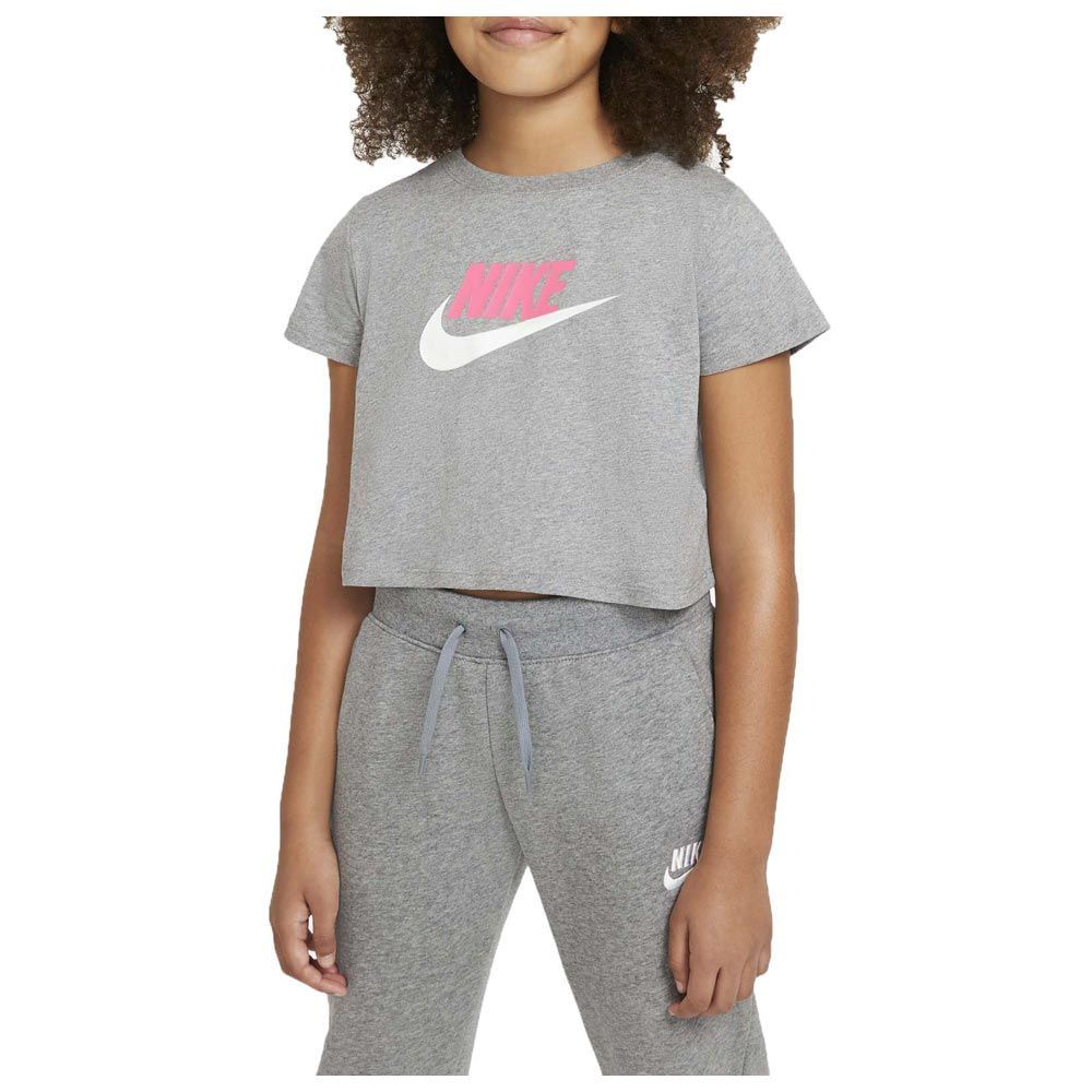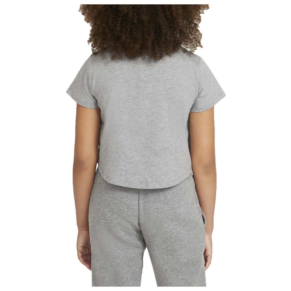 Детская укороченная футболка Nike Sportwear выполнена из хлопка и отличается современным дизайном. Такая футболка понравится каждой девочки и поможет выделиться среди сверстников. Универсальный серый цвет модели подойдет, как детям, так и подросткам. На груди нанесен контрастная графика и логотип бренда, которые завершают фирменный дизайн. Легкая хлопковая ткань создает ощущение мягкости и комфорта в течение всего дня. Хлопок отличается отличными дышащими свойствами и износостойкостью. За футболкой легко ухаживать, она не растягивается со временем и не выцветает, даже после многочисленных стирок. Стандартный крой отлично сидит на любой фигуре и не сковывает движения во время активных детских игр. Горловина из рубчатой ткани и плоские швы не натирают и не раздражают кожу. Такая удобная и качественная футболка обязательно займет место в спортивном гардеробе ребенка и будет радовать в течение многих лет.Особенности и преимущества: